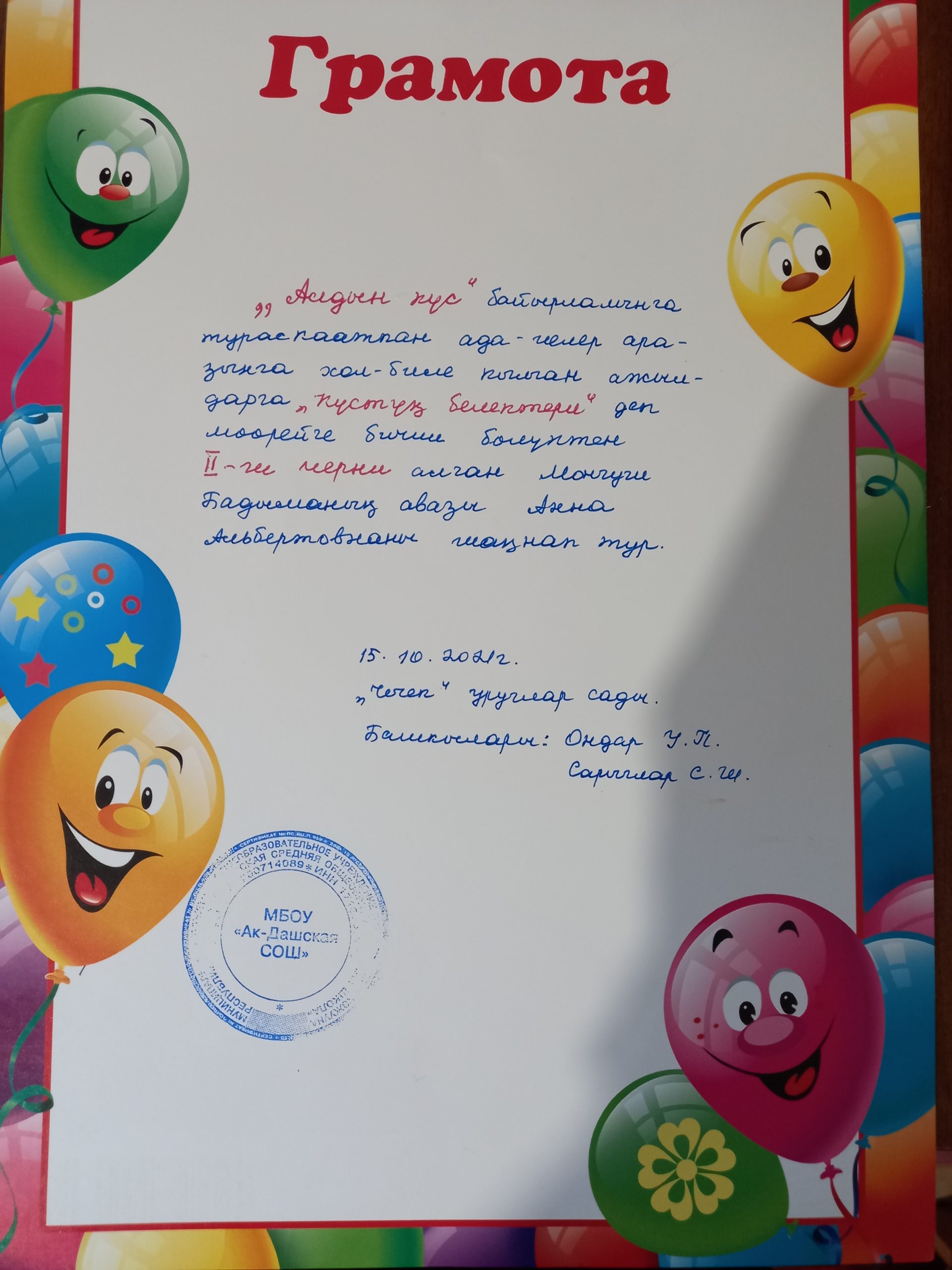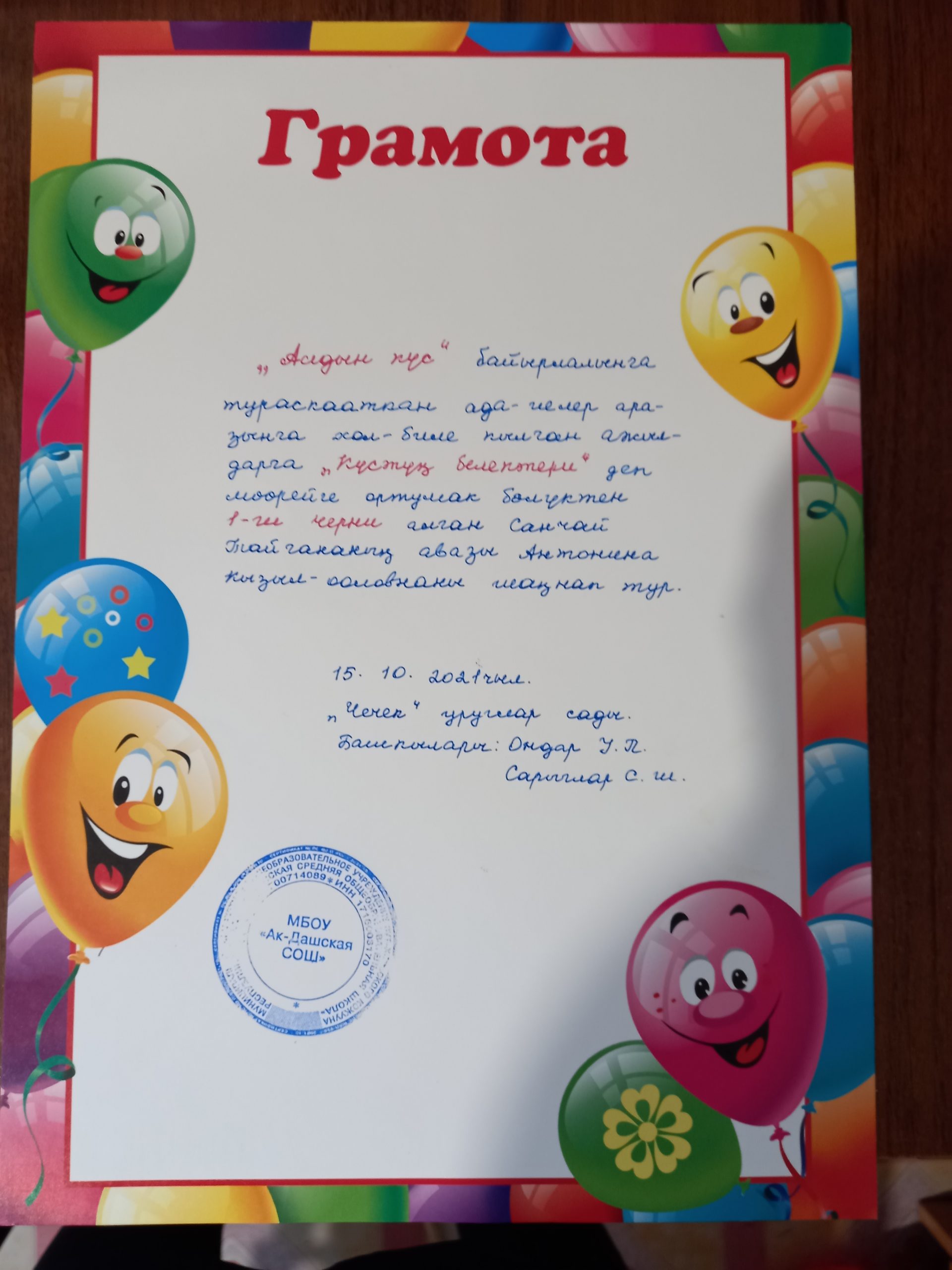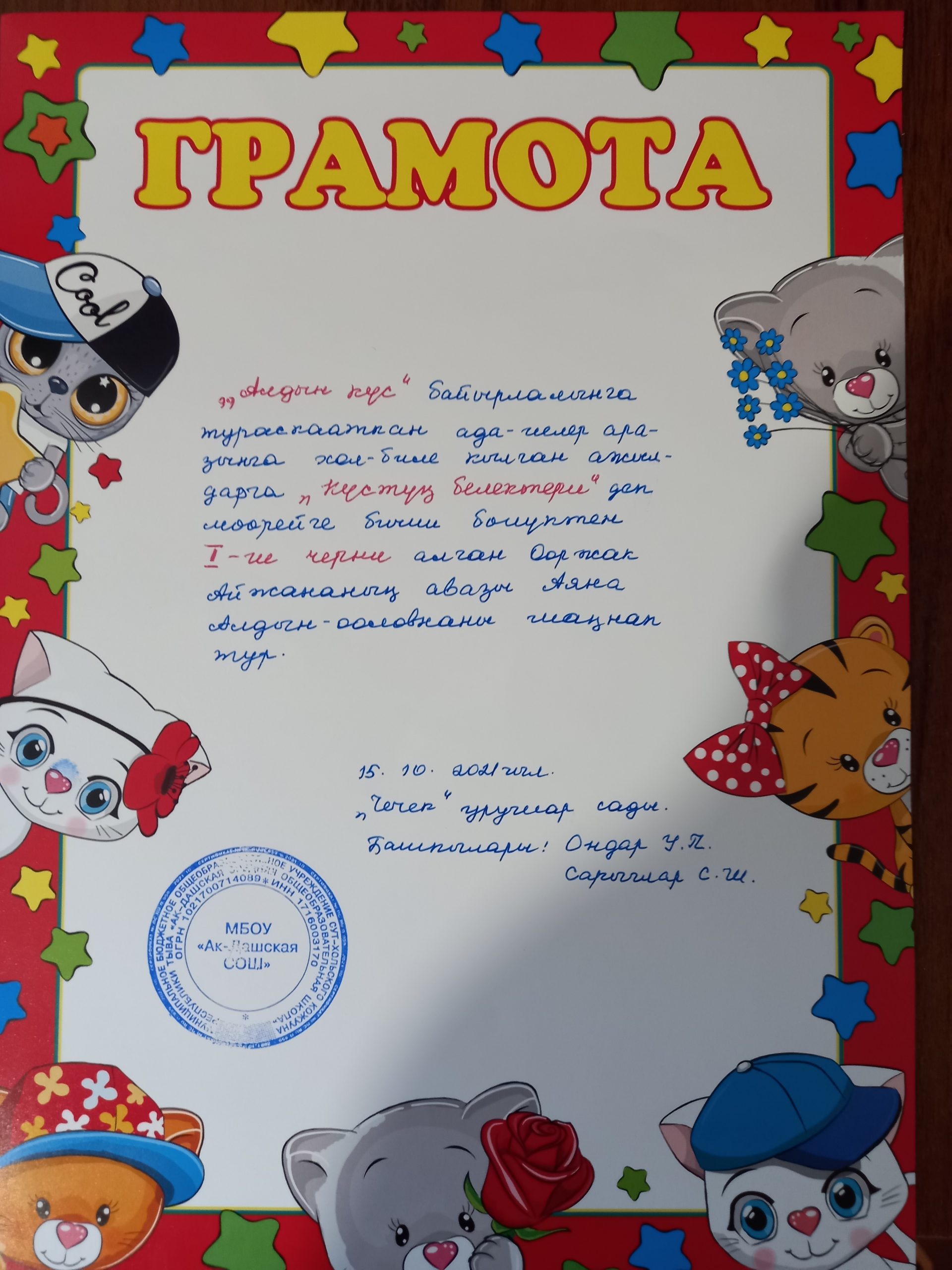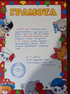 Справка об участии V Всероссийском дистанционном конкурсе детских рисунков «Любимый герой мультфильма» Дата проведения: с 5 сентября по 21 октября 2022г. Все дети очень любят смотреть мультфильмы. Почти у каждого ребенка есть любимый герой мультфильма. Дети старшей группы нашего детского сада «Чечек» приняли участие V Всероссийском дистанционном конкурсе детских рисунков «Любимый герой мультфильма». Основные цели и задачи конкурса: — развитие детского художественного творчества; — формирование эстетического вкуса детей; — поддержка одаренных детей; — повышение творческой активности; — предоставление участникам конкурса возможности принять участие в соревновании всероссийского масштаба. Дети с большим удовольствием и интересом выполнили, рисовали герои своих любимых мультфильмов. Отправили работы детей, подготовившие участников конкурса Ондар Уянмаа Павловна, воспитатель старшей группы, Сарыглар…